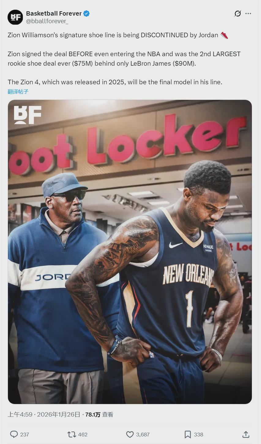北京时间1月26日,据球鞋媒体Sole Retriever的爆料,Jordan Brand不会为鹈鹕球星锡安-威廉森推出第5代签名鞋,他现在所穿的Zion4成为锡安签名鞋的绝唱。锡安和Jordan Brand的合同7年7500万美元,将在今年7月份到期。